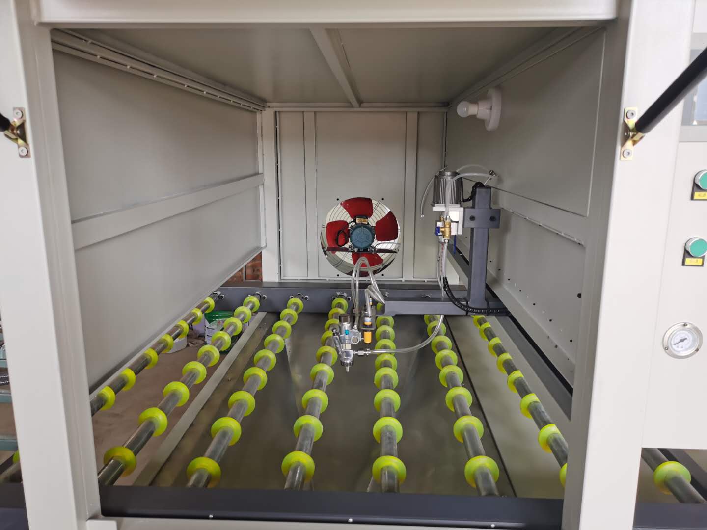 9.設(shè)備為外接式風(fēng)機(jī),所有漆霧都過(guò)濾排放,本機(jī)是集清潔、噴淋滴一體的智能型機(jī)器,工作無(wú)污染,